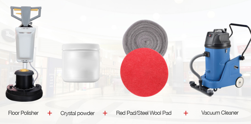 The crystal surface machine-installed red pad scouring pad and crystal powder grind and heat the marble, and then reach a certain temperature, so that the crystal powder crystallizes on the surface of the stone to form a protective layer. After completion, use a vacuum cleaner to dry the moisture and residue. Then use the crystal surface machine to install steel wool pads to maintain the ground.